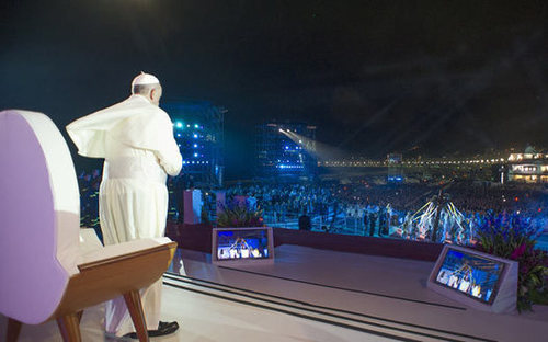 Pope Francis arrives in Copacabana for WYD welcoming ceremony with youthshttp://en.romereports.com After a brief helicopter flight, Pope Francis arrived at Rio's Copacabana, the main venue of WYD 2013. On his popemobile, the Pope ...